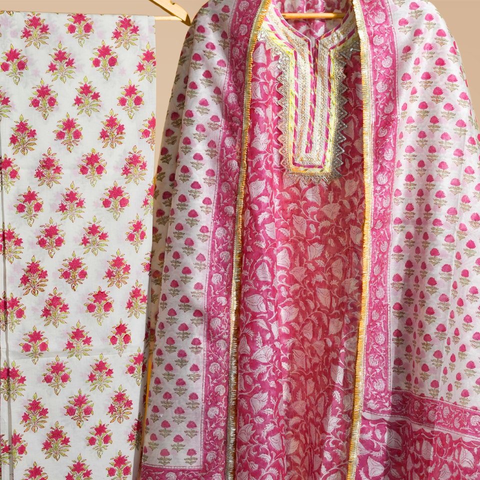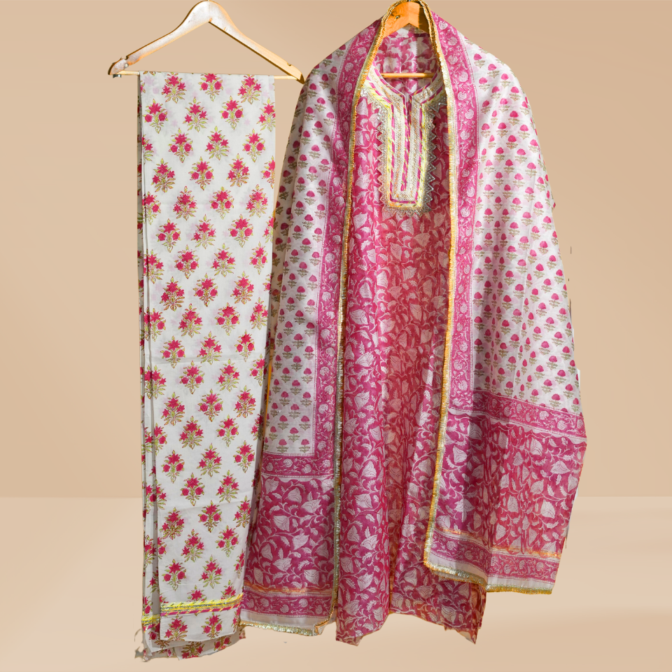 The Gulbahar Suit Set is crafted in soft Chanderi fabric with delicate handblock prints and gold lace detailing. Its elegant pink tones and breezy texture make it a timeless festive favorite. Perfect for pujas, brunches, or traditional gatherings.