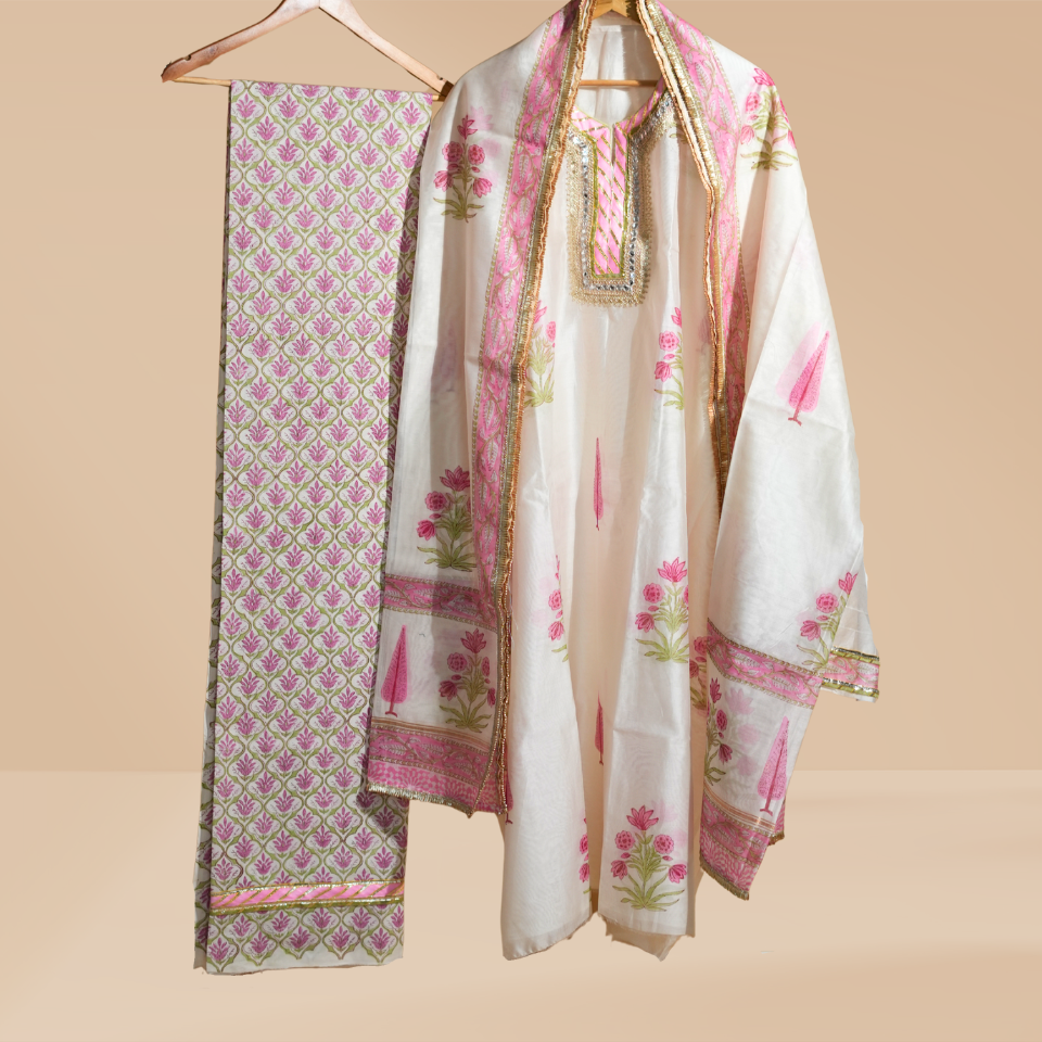 Ritika Rosette captures the essence of femininity with its pink floral handblock prints and gold-edged dupatta. Crafted in soft Chanderi, it’s light, festive, and timeless.