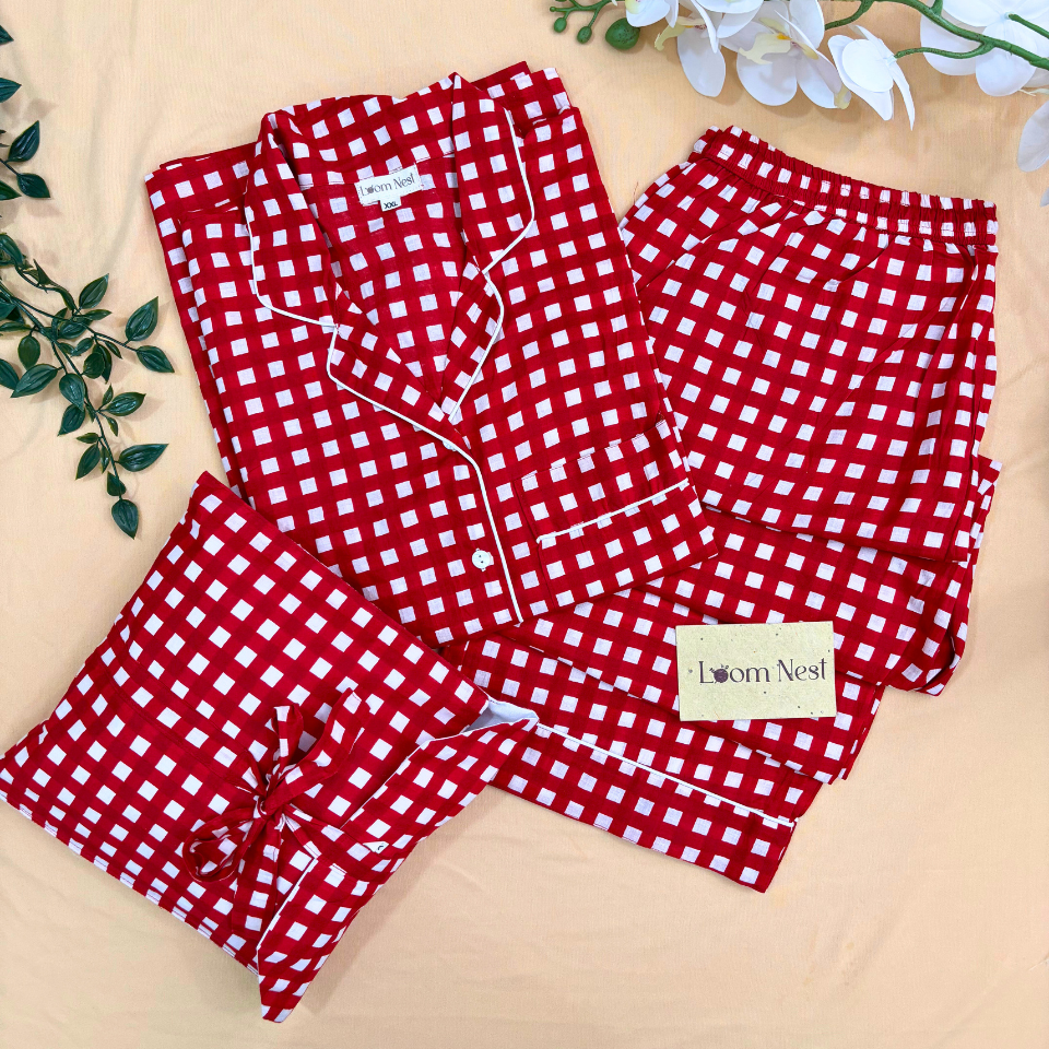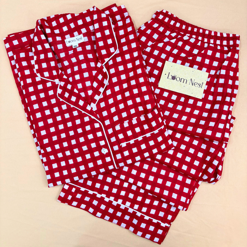 Step into style with our exclusive night suits . This outfit gives you all the room to slay as it comes with an oversized shirt featuring front button placket and straight leg pants featuring elasticated waist . Wash Care: Dry clean or gentle hand wash in cold water using a mild detergent. Do not soak or tumble dry. Dry in shade. Use a warm iron.