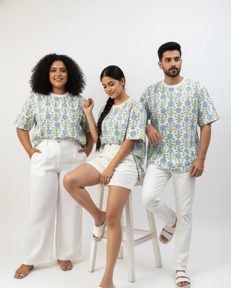 A timeless blend of comfort and heritage, this Teal Mughal Buta Hand Block Printed Unisex T-Shirt features intricate floral buta motifs inspired by traditional Mughal artistry. Crafted from premium 240 GSM stretch cotton, it offers a soft, breathable feel with a modern regular-fit silhouette. Naturally dyed and ethically handcrafted in India, each piece is unique with slight variations that celebrate true artisanal craftsmanship.
